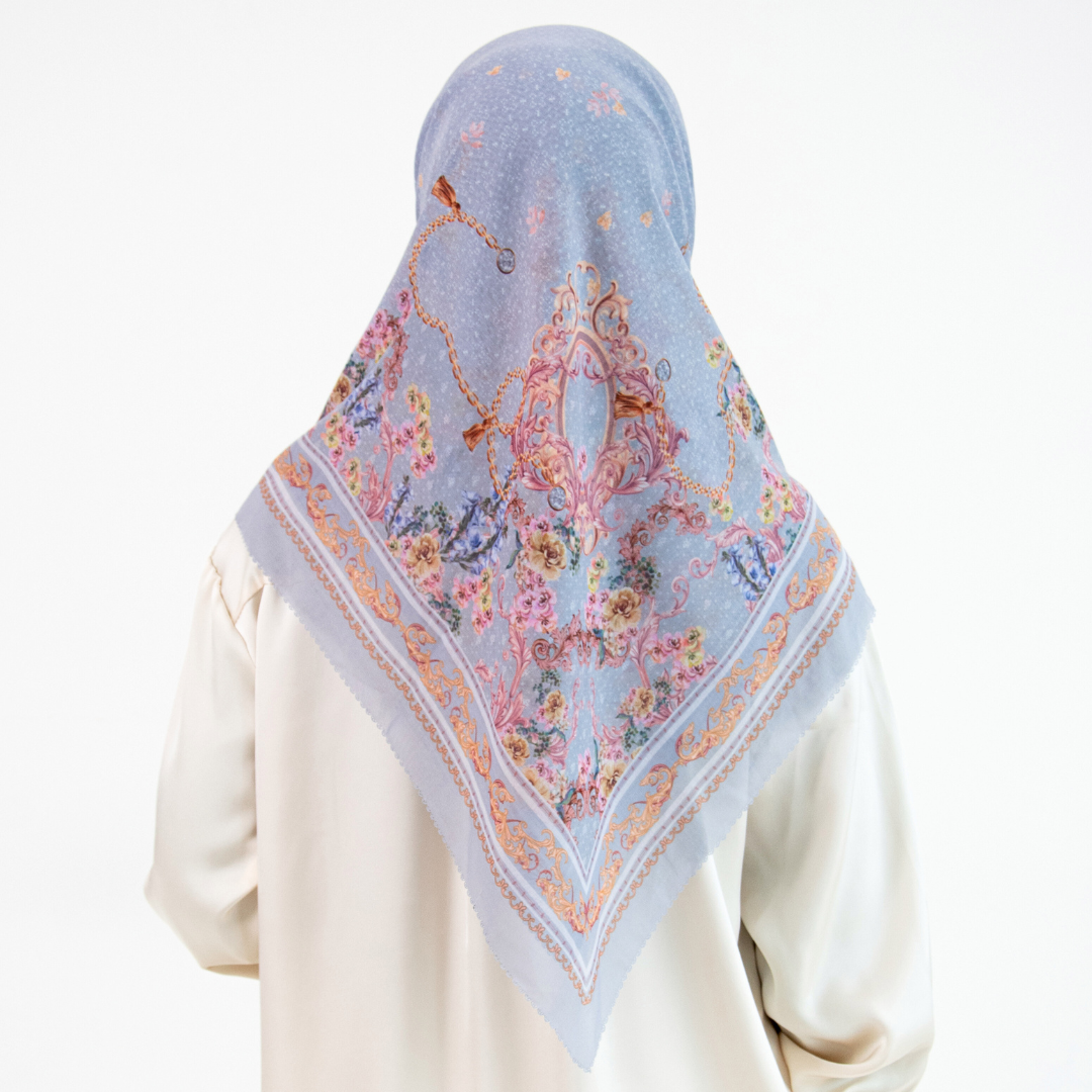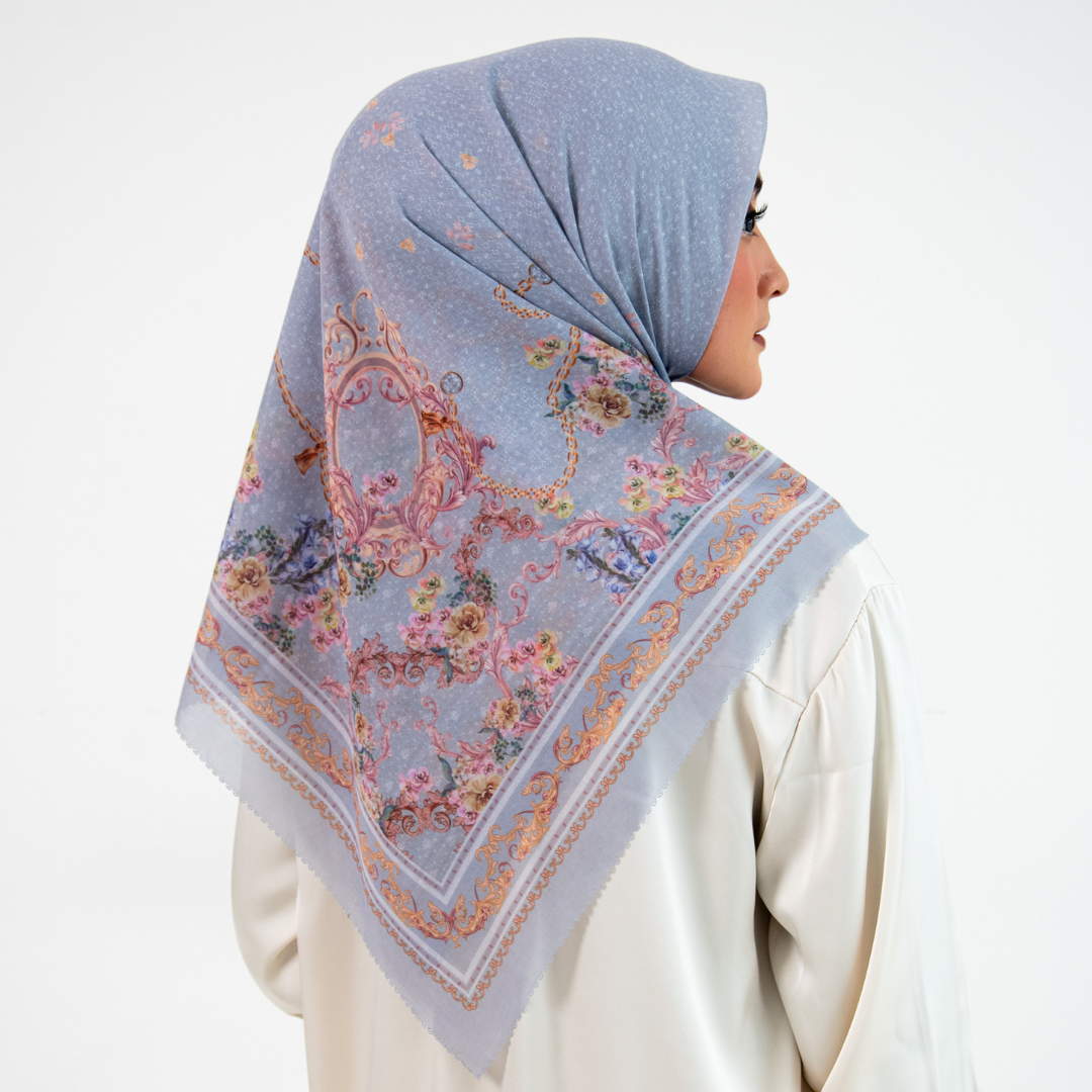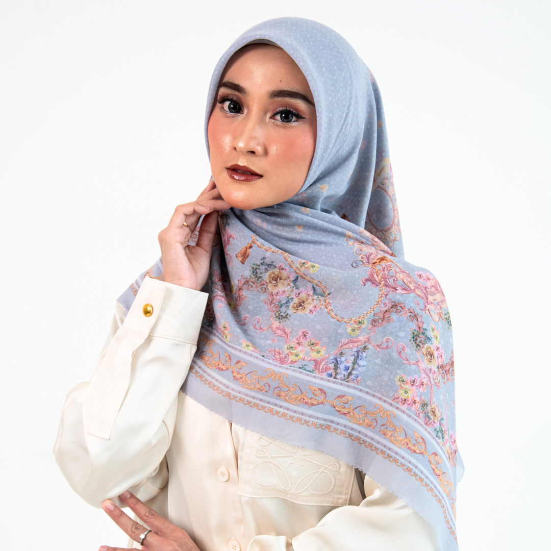 Hijab Segi Empat Series berkualitas tinggi yang mengusung tema Legacy of a Mother’s Grace, menggambarkan perjalanan sebuah brand yang tumbuh dari warisan cinta seorang ibu – ketulusan, ketekunan, dan kasih tanpa batas. Desain ini menjadi simbol elegansi dan kehangatan dalam proses tumbuh, dari kenangan masa lalu menuju kejayaan masa depan. Desainnya mengusung gaya vintage minimalis dengan sentuhan ornamen baroque mewah,dimana lengkungan lengkungan motif yang saling berjalin melambangkan pelukan kasih antara ibu dan putri sebagai fondasi kuat lahirnya karakter dan identitas brand.