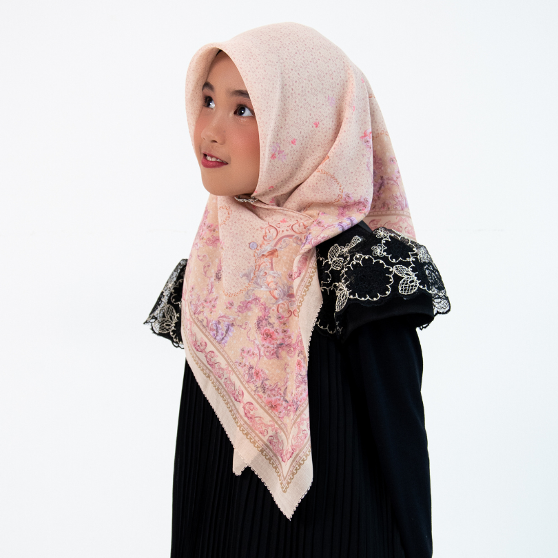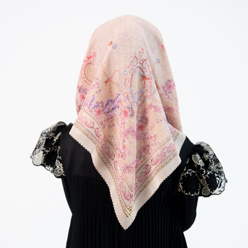 Hijab Segi Empat Series berkualitas tinggi yang mengusung tema Legacy of a Mother’s Grace, menggambarkan perjalanan sebuah brand yang tumbuh dari warisan cinta seorang ibu – ketulusan, ketekunan, dan kasih tanpa batas. Desain ini menjadi simbol elegansi dan kehangatan dalam proses tumbuh, dari kenangan masa lalu menuju kejayaan masa depan. Desainnya mengusung gaya vintage minimalis dengan sentuhan ornamen baroque mewah,dimana lengkungan lengkungan motif yang saling berjalin melambangkan pelukan kasih antara ibu dan putri sebagai fondasi kuat lahirnya karakter dan identitas brand.
