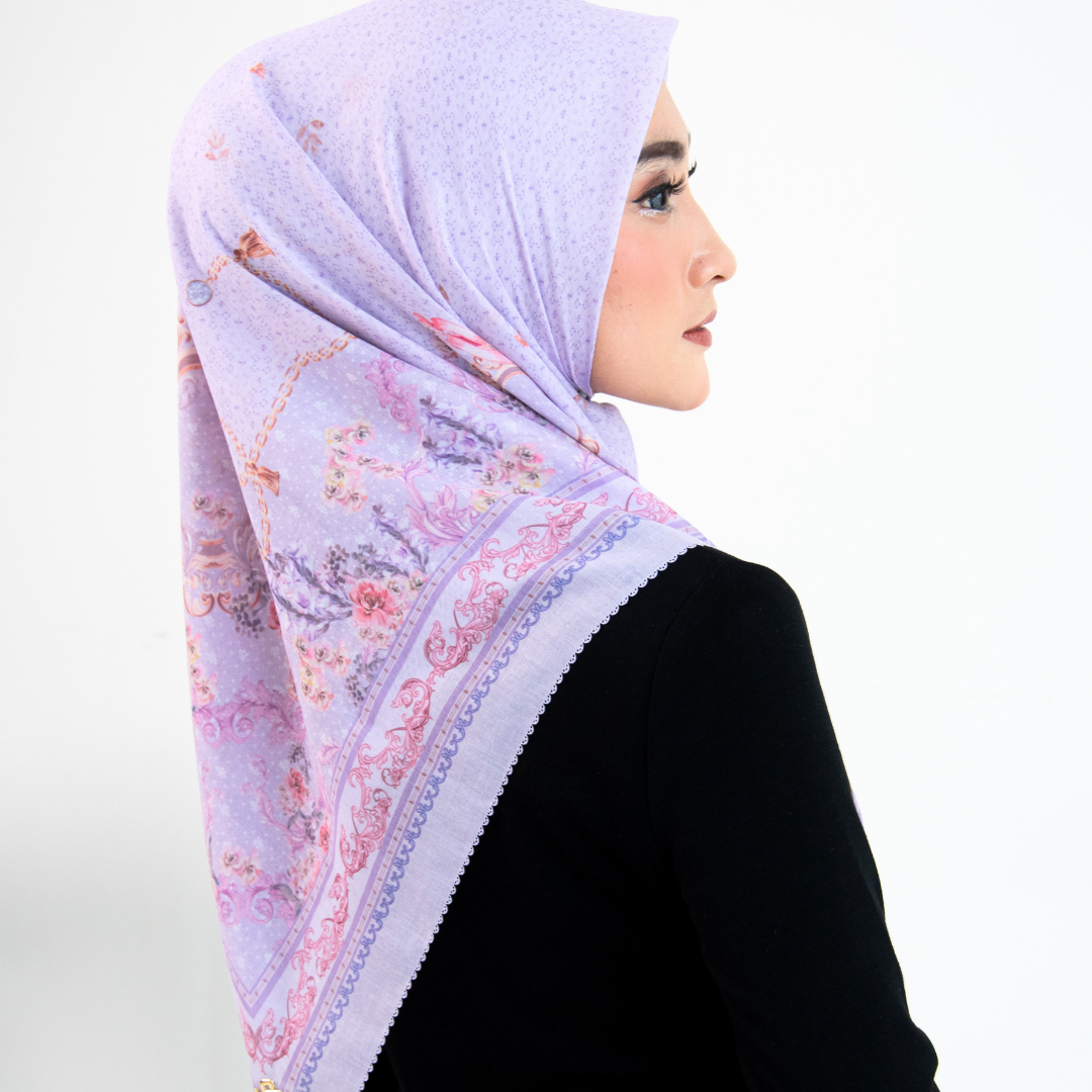 Hijab Segi Empat Series berkualitas tinggi yang mengusung tema Legacy of a Mother’s Grace, menggambarkan perjalanan sebuah brand yang tumbuh dari warisan cinta seorang ibu – ketulusan, ketekunan, dan kasih tanpa batas. Desain ini menjadi simbol elegansi dan kehangatan dalam proses tumbuh, dari kenangan masa lalu menuju kejayaan masa depan. Desainnya mengusung gaya vintage minimalis dengan sentuhan ornamen baroque mewah,dimana lengkungan lengkungan motif yang saling berjalin melambangkan pelukan kasih antara ibu dan putri sebagai fondasi kuat lahirnya karakter dan identitas brand.