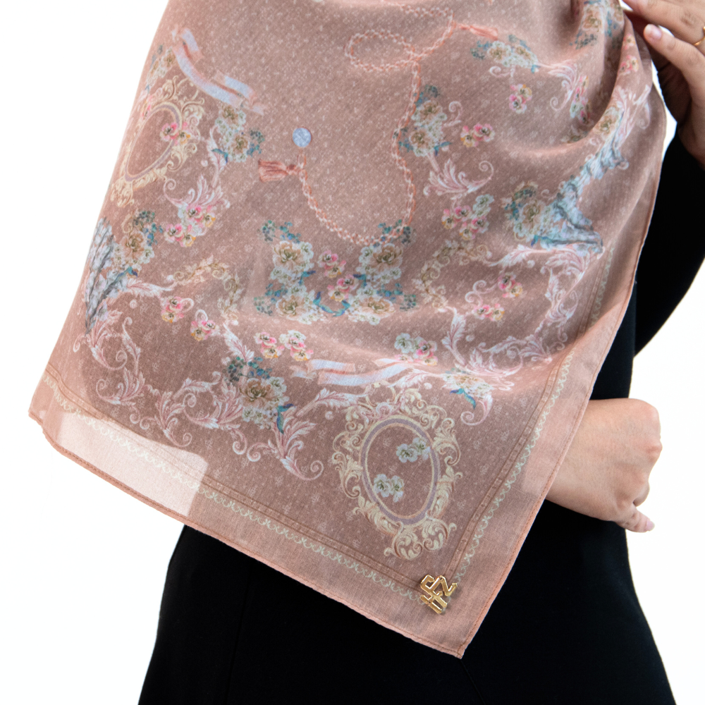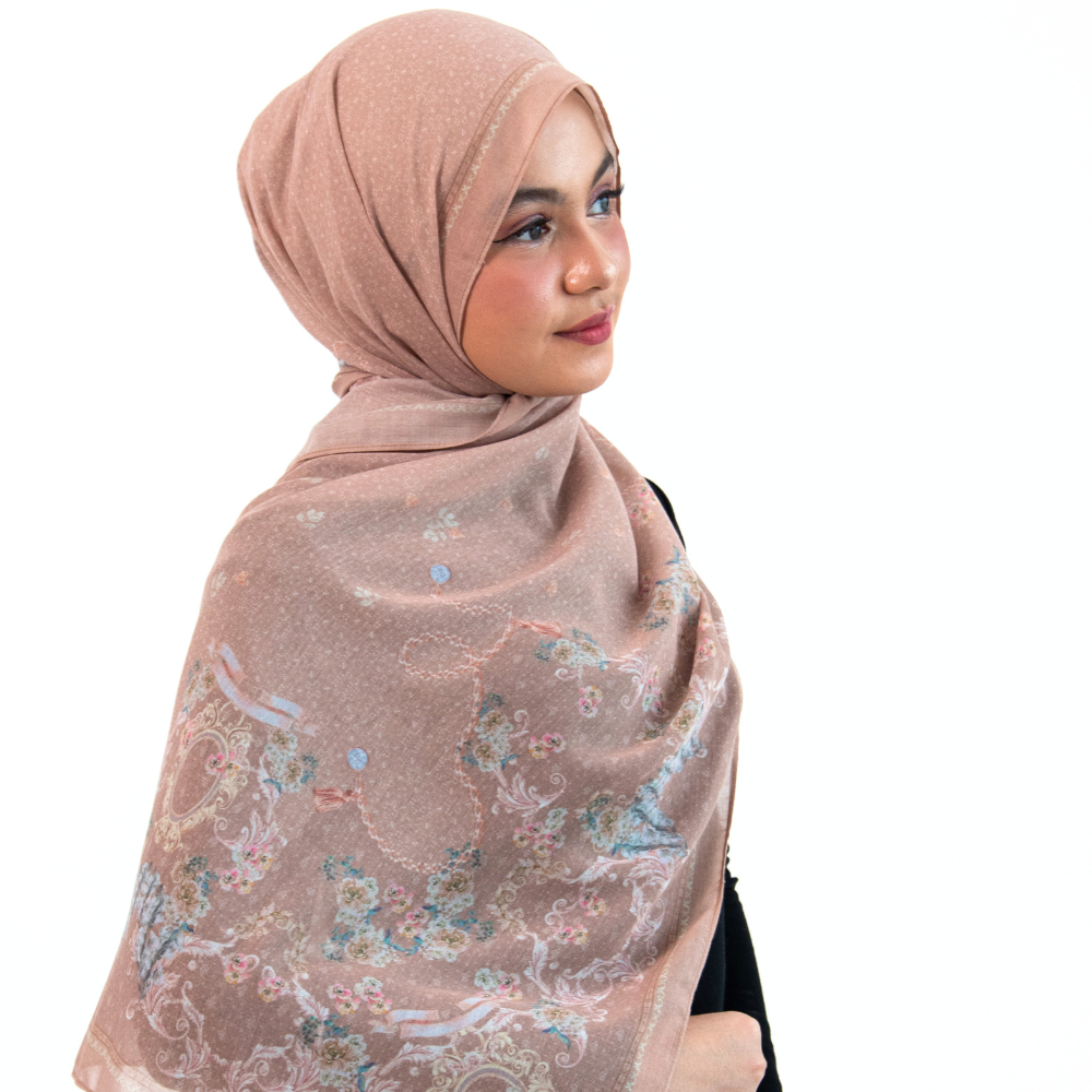 Hijab Segi Empat Series berkualitas tinggi yang mengusung tema Legacy of a Mother’s Grace, menggambarkan perjalanan sebuah brand yang tumbuh dari warisan cinta seorang ibu – ketulusan, ketekunan, dan kasih tanpa batas. Desain ini menjadi simbol elegansi dan kehangatan dalam proses tumbuh, dari kenangan masa lalu menuju kejayaan masa depan. Desainnya mengusung gaya vintage minimalis dengan sentuhan ornamen baroque mewah,dimana lengkungan lengkungan motif yang saling berjalin melambangkan pelukan kasih antara ibu dan putri sebagai fondasi kuat lahirnya karakter dan identitas brand.
