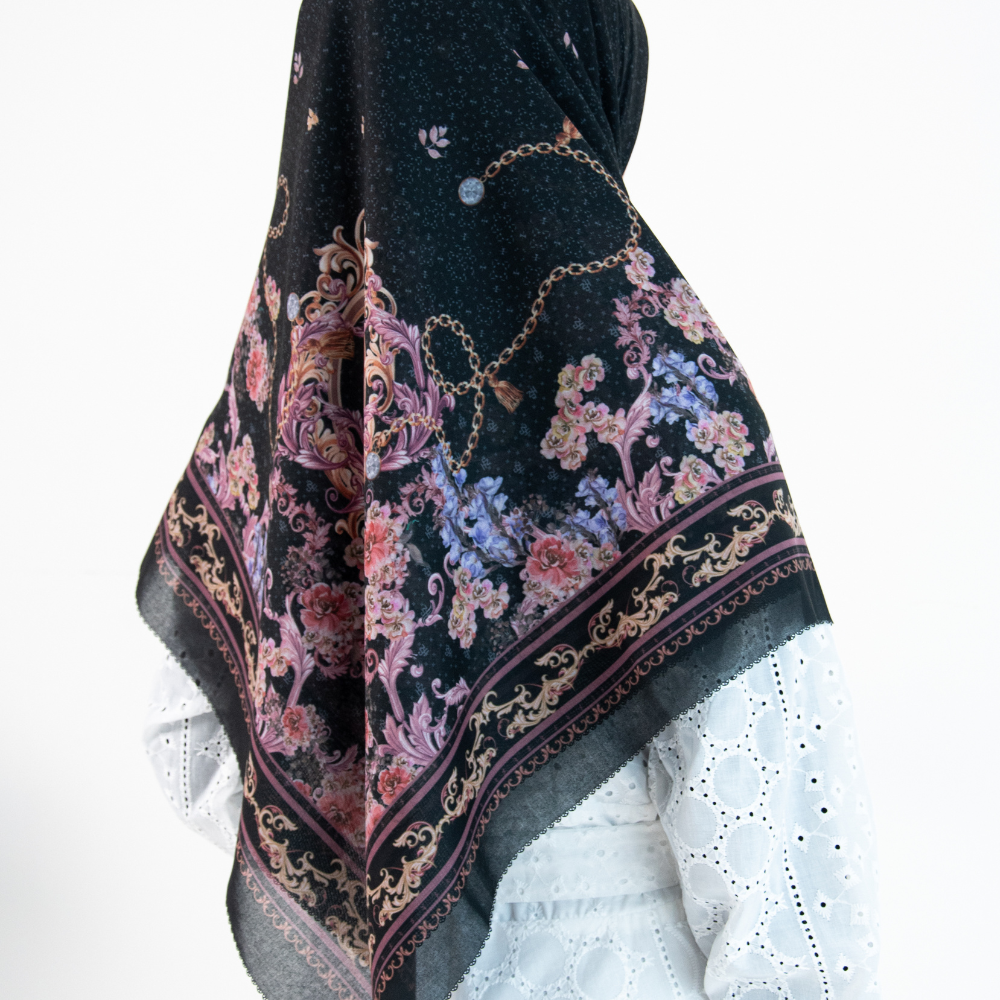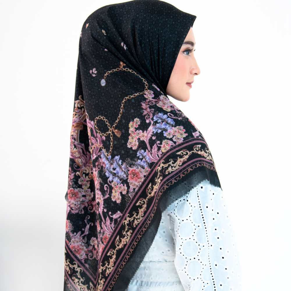 Hijab Segi Empat Series berkualitas tinggi yang mengusung tema Legacy of a Mother’s Grace, menggambarkan perjalanan sebuah brand yang tumbuh dari warisan cinta seorang ibu – ketulusan, ketekunan, dan kasih tanpa batas. Desain ini menjadi simbol elegansi dan kehangatan dalam proses tumbuh, dari kenangan masa lalu menuju kejayaan masa depan. Desainnya mengusung gaya vintage minimalis dengan sentuhan ornamen baroque mewah,dimana lengkungan lengkungan motif yang saling berjalin melambangkan pelukan kasih antara ibu dan putri sebagai fondasi kuat lahirnya karakter dan identitas brand.