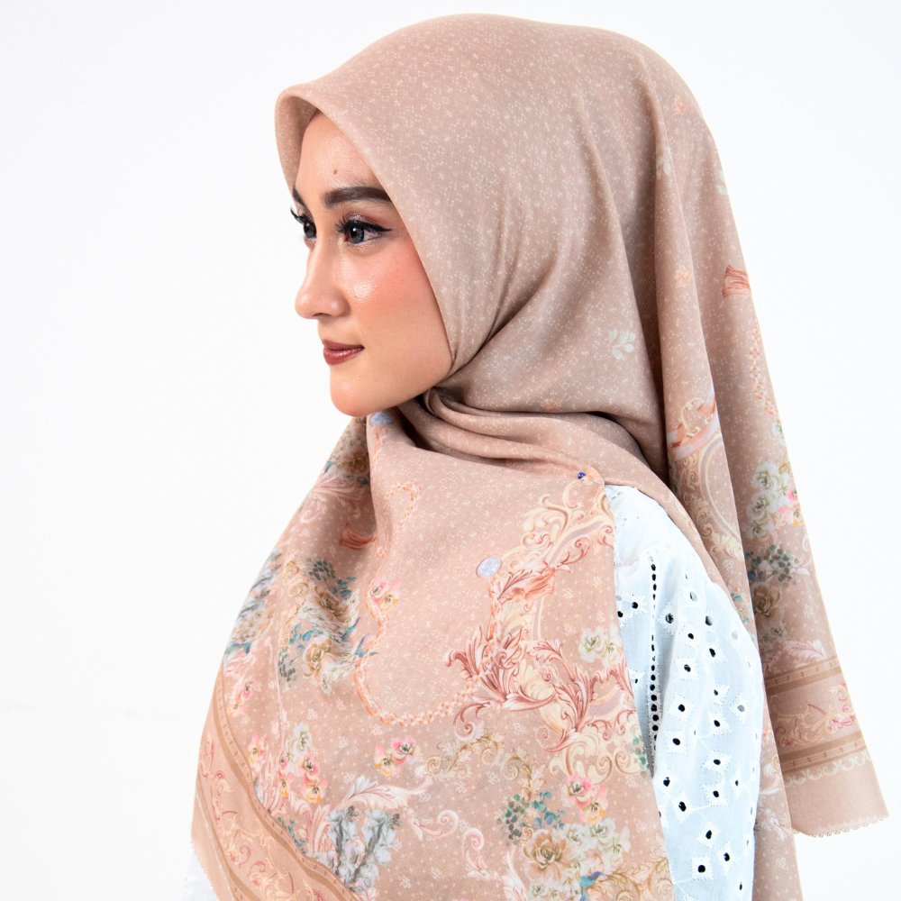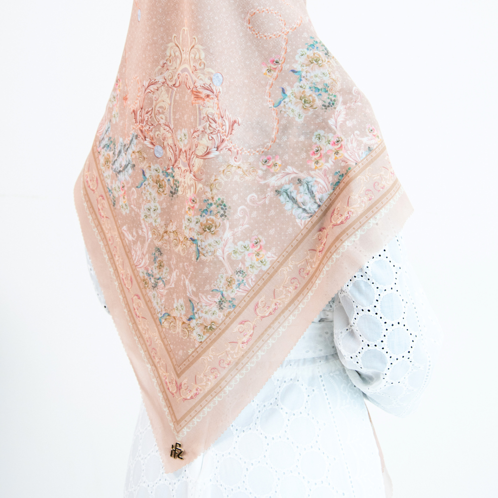 Hijab Segi Empat Series berkualitas tinggi yang mengusung tema Legacy of a Mother’s Grace, menggambarkan perjalanan sebuah brand yang tumbuh dari warisan cinta seorang ibu – ketulusan, ketekunan, dan kasih tanpa batas. Desain ini menjadi simbol elegansi dan kehangatan dalam proses tumbuh, dari kenangan masa lalu menuju kejayaan masa depan. Desainnya mengusung gaya vintage minimalis dengan sentuhan ornamen baroque mewah,dimana lengkungan lengkungan motif yang saling berjalin melambangkan pelukan kasih antara ibu dan putri sebagai fondasi kuat lahirnya karakter dan identitas brand.